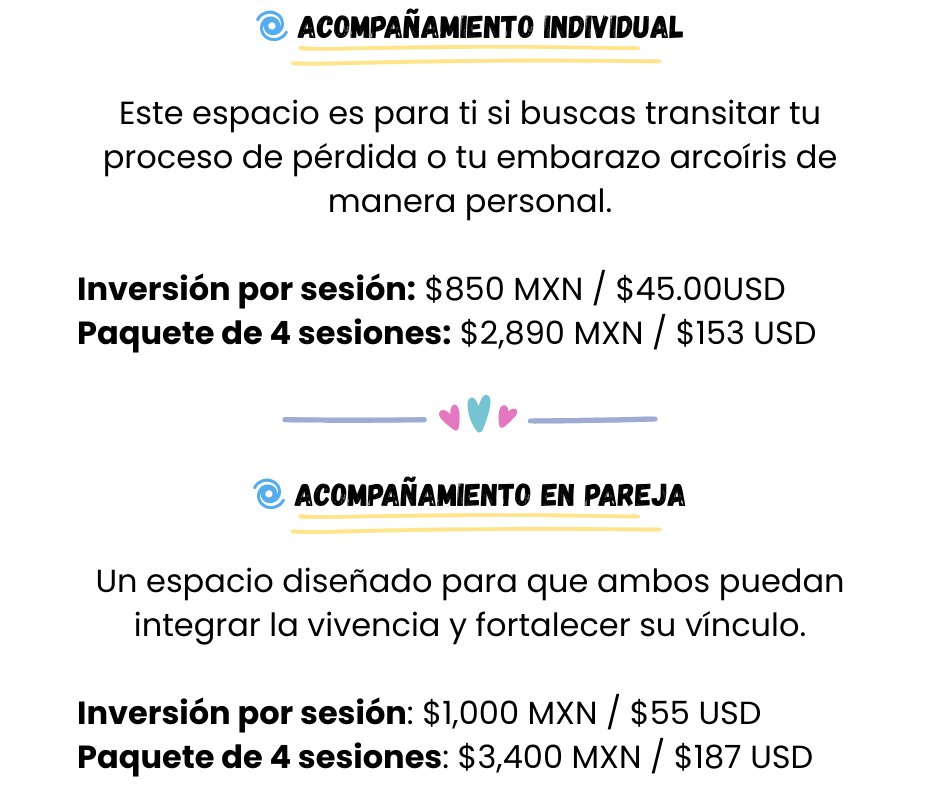 📌 ¿Qué pasa si no puedo tomar mis 4 sesiones en los 40 días hábiles? La vigencia de 8 semanas está pensada para dar continuidad real a tu proceso de pérdida o al seguimiento de tu embarazo arcoíris. Si por alguna razón personal no utilizas las sesiones en ese tiempo, estas expiran sin posibilidad de reembolso o prórroga. Mi recomendación es agendar tus 4 espacios desde el momento del pago para asegurar tu lugar.